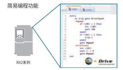 RX2系列,可通過(guò)支持工具CX-Drive創(chuàng)建時(shí)序程序,單臺(tái)變頻器就能進(jìn)行簡(jiǎn)單的時(shí)序控制。因此,可以在無(wú)PLC的狀態(tài)下構(gòu)建起重機(jī)控制、張力控制等要求控制速度的大型工序,實(shí)現(xiàn)最佳性價(jià)比。